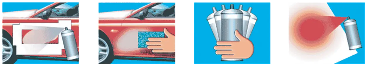 | 5. Ограничить окрашиваемую поверхность с помощью малярной ленты и нанести аэрозольную шпатлевку. | 6. Повторно отшлифовать поверхность наждачным полотном № 500-800. | 7. Перед применением баллон встряхивать в течение 2-3 минут. | 8. Перед окрашиванием сделать контрольную выкраску на металлической поверхности. |