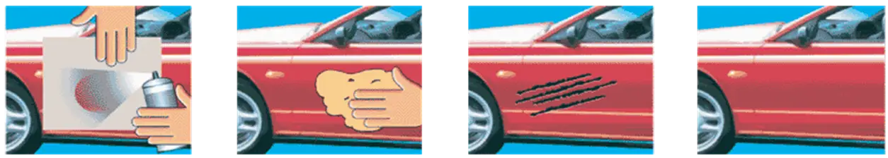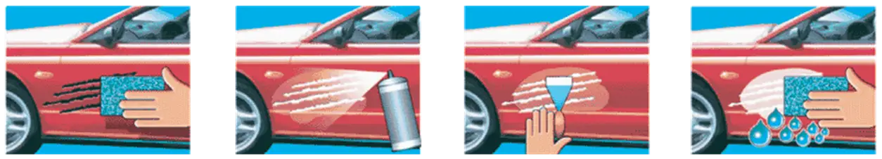 | 1. Поврежденный участок зачистить шлифовочным полотном № 60-80 до металла. | 2. Обработать поверхность обезжиривателем | 3. При необходимости на поврежденное место нанести шпатлевку. Дать поверхности высохнуть. | 4. Поверхность шлифовать наждачным полотном № 120-180, используя при этом воду. |